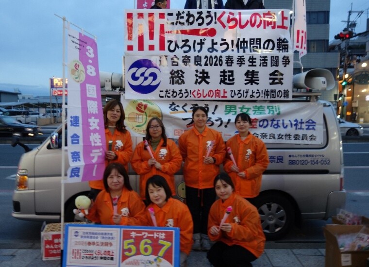 毎年、春季生活闘争に位置付けて連合奈良女性委員会で取り組んでいる「3.8国際女性デー」の街頭行動を近鉄奈良駅前にて実施。